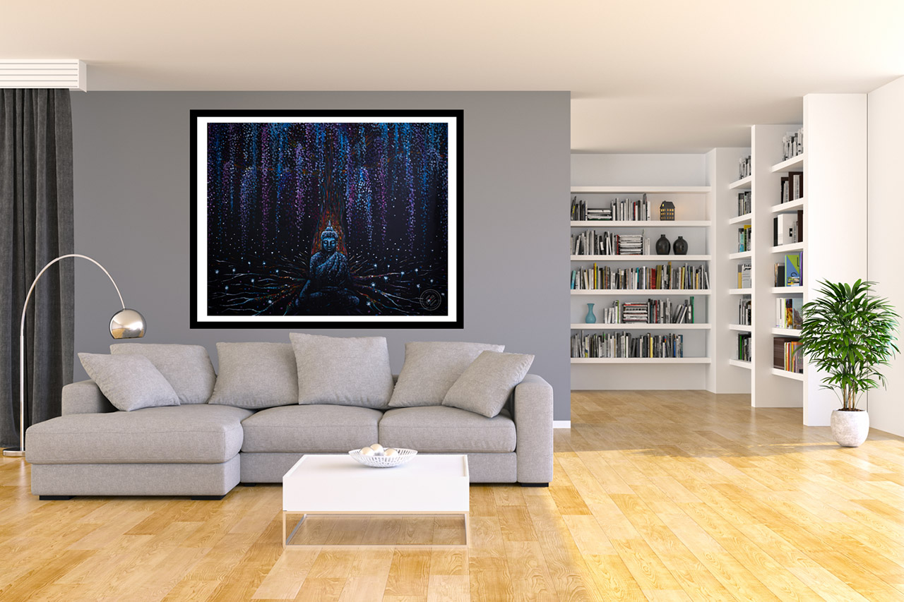 This piece, one of a collection of 4 representing the four seasons of Buddha, pushes the boundaries of natures’ potential further. At night we see that the plants and weeping willow provide natural light and a source of energy for Buddha. This piece conveys serenity and spirituality, and being at one with your surroundings. With a similar colour scheme throughout, the Buddha and the tree become ‘one’ during his quest for inner peace.