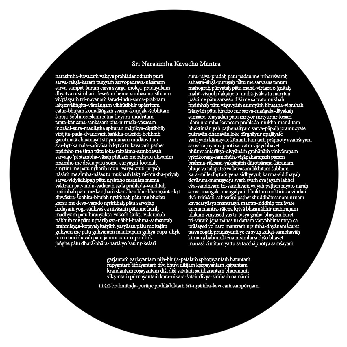 Lord Narasimha is the fourth incarnation of Lord Vishnu. Narasimha means half man half lion, Nara means Human and Simha means Lion. Lord Narasimha appeared in this form to protect his devotee Prahlad from his father, Hiranyakashipu. Kavacha means Shield of Armour. Thus the Kavacha Strotram is a prayer that is offered to the Lord by Prahlad for protection.