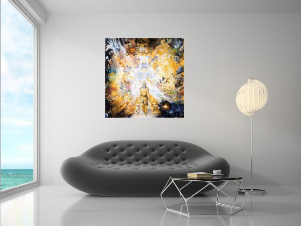In two moments of the Mahabharata Lord Krishna showed the Vishva Rupa revealing his Divine Nature as Vishnu, the Supreme God. In this painting the artist tries to elaborate His first performance of the so called Universal Form. It is a complex vision explained in an entire chapter of the Bhagavad Gita. The Supreme Being expands in infinite dimensions and entities. The immensity of the universe and the complexity of its constituents are impossible to understand in full. The resulting unusual perception is a network of chaotic and apocalyptic elements, viewed from multiple angels and unusual perspectives as Lord Krishna manifests His Universal Form for the first time.