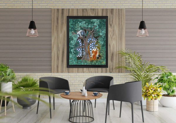 The artist’s first depiction in Lanka of Sita in a beautiful garden surrounded by greenery and foliage with a beautiful tree in the centre of this artwork.